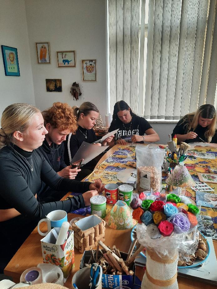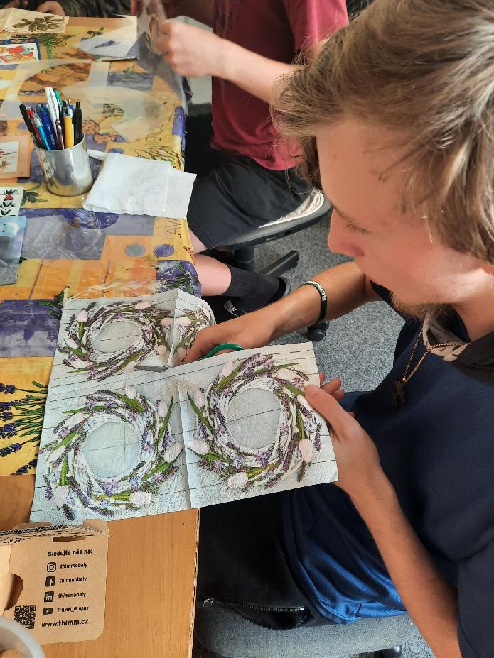 V září jsme se vrhli do tvoření rovnýma nohama. Dny se krátí, a tak jsme udělali roztomilou a skoro až romantickou lampičku. K práci jsme potřebovali plastovou podložku, kterou jsme vystřihli do tvaru půlkruhu, ubrousek, lepidlo a tavnou pistoli. Na vystřižený půlkruh jsme nalepili ubrousek, stočili do tvaru stínítka a tavkou slepili. No a po zaschnutí jen umístili na skleničku s nožkou. Na závěr stačilo vložit světýlka a bylo hotovo. Všem se moc povedlo a samozřejmě byla pohoda i legrace.