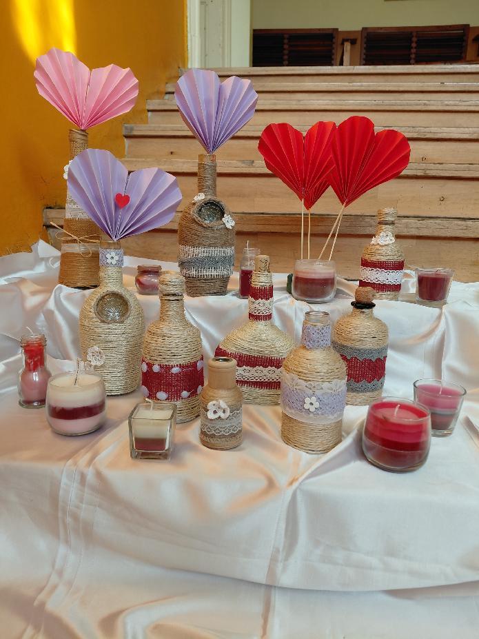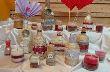 Potřebovali jsme láhev pěkného tvaru, provázek, krajku a něco na ozdobení. Největším oříškem bylo omotání samotné lahve. Ne všechny měly rovné stěny. Byla to nesnadná a pomalá práce. Místy se muselo přilepovat tavnou pistolí, aby vše drželo tam, kde má. Když byla láhev omotána, přišlo na řadu zdobení. Každý sáhl po krajce, která se mu nejvíce zamlouvala. To, co vzniklo na konci, absolutně předčilo nejen moje očekávání, ale i samotných výrobců. Posuďte sami, krása! Doufám, že výrobky udělají radost případným obdarovaným, zvlášť pokud bude mít lahvička i nějaký atraktivní obsah.