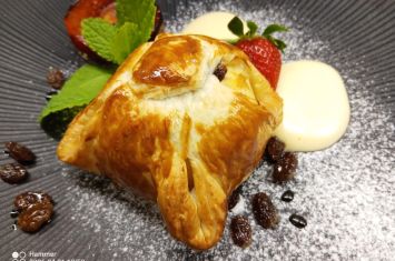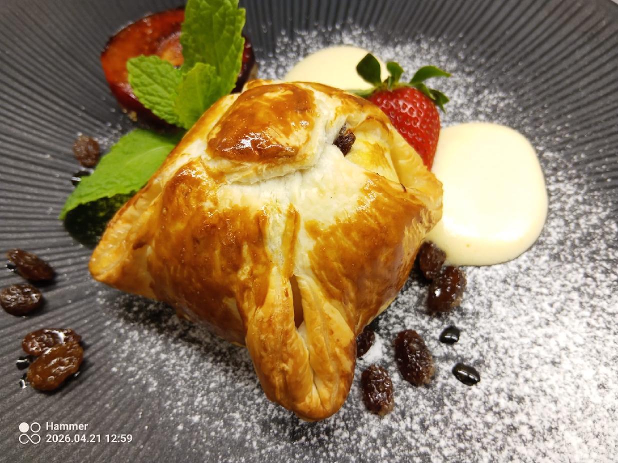 Sladkou tečkou byl dezert jablko v županu s vanilkovou pěnou, nočky ze zakysané smetany a nakládaná švestka v brandy, který vhodně završil celkový gastronomický dojem.