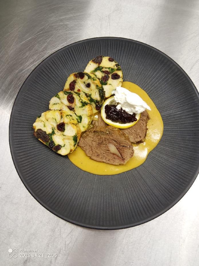Hlavní chod představovala pečená jelení kýta se svíčkovou omáčkou, doplněná karlovarským knedlíkem s baby špenátem, brusinkovým terčem a šlehačkou. Právě svíčková omáčka se stala podle hodnocení odborníků vrcholem celého menu a získala nejvyšší ocenění.